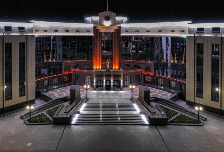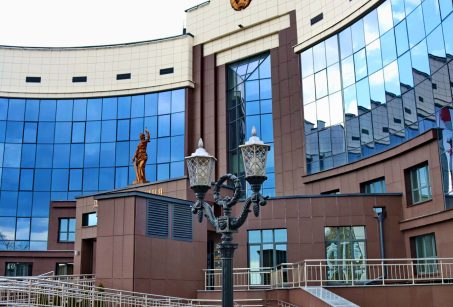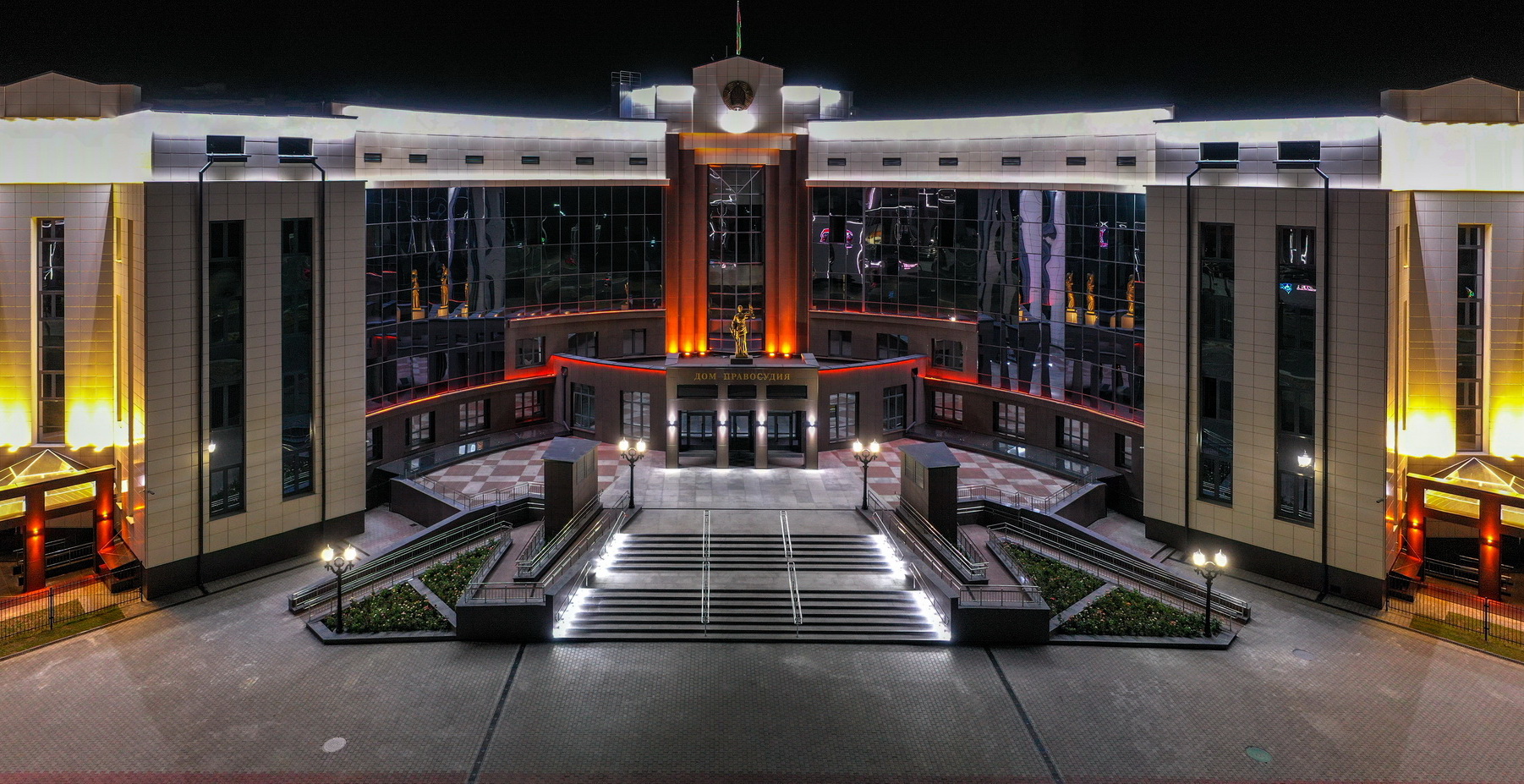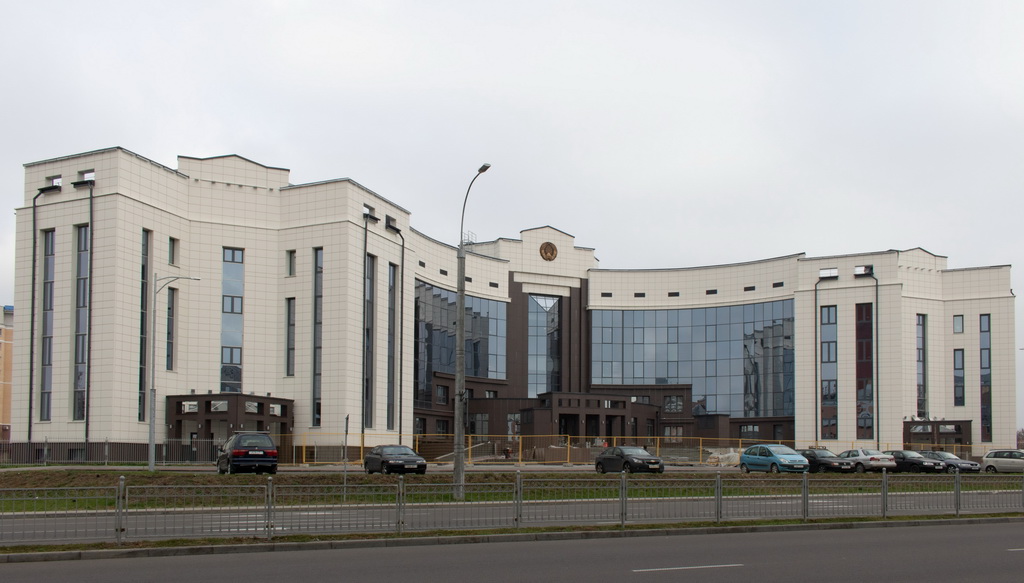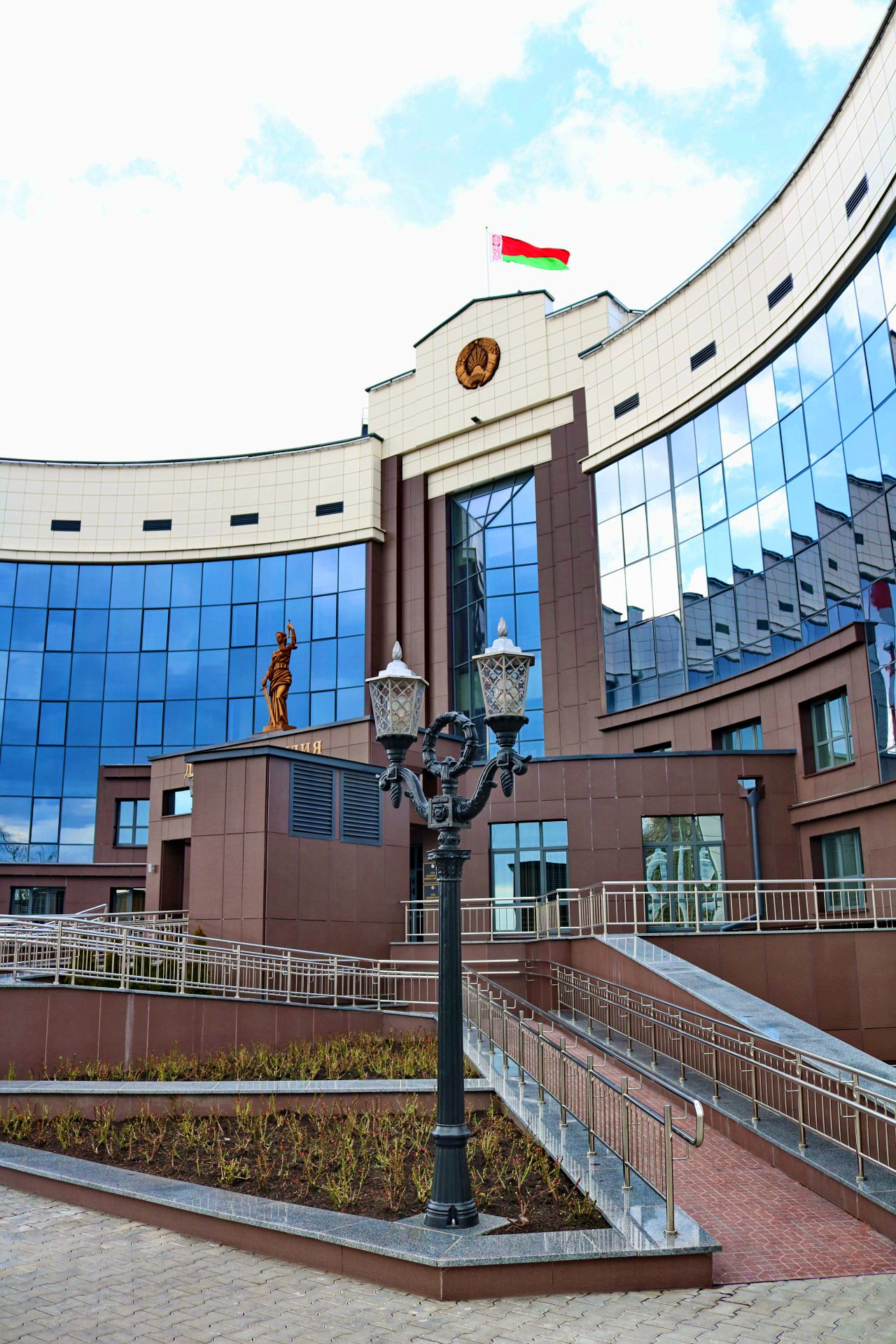 У вонкавым абліччы будынка асноўны акцэнт прыпадае на цэнтральную яго частку, выразнасць якой дасягнута з дапамогай сістэмы вітражоў і вентфасадаў. У кампазіцыі ўлічана дзяржаўная сімволіка (сцяг, герб) і ў цэнтры ўсёй кампазіцыі на плошчы - статуя Феміды. Для арганізацыі пляца перад галоўным уваходам у будынак, якая мае вялікае функцыянальнае значэнне паўцыркульна.