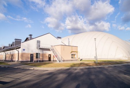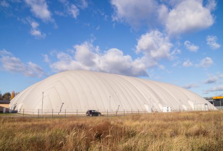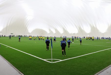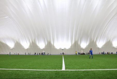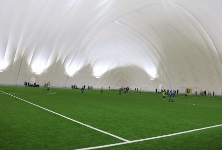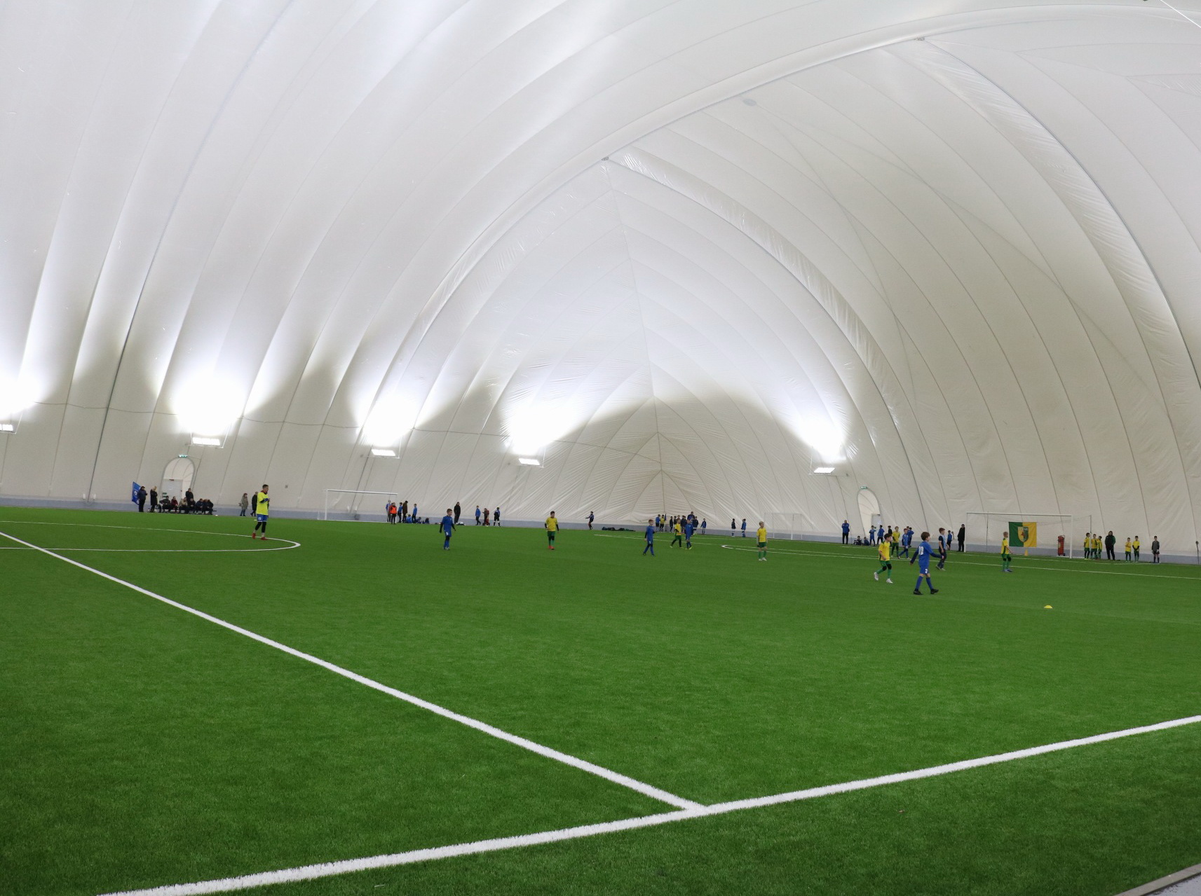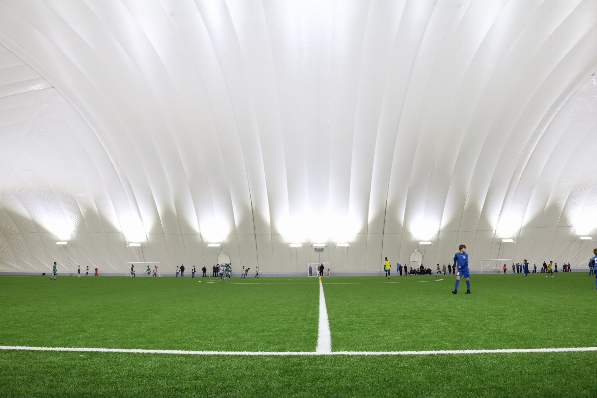 На сённяшні момант крытыя футбольныя манежы ёсць у Мінску, Пінску і Гродне, а зараз і ў Брэсце. Брэсцкі манеж будаваўся па гродзенскім варыянце, які прадугледжвае выраб аб'екта на паветраапорных канструкцыях. Плошча, якую накрывае надзіманы дах, складае 116 на 82 метры, вышыня абалонкі 23 метры, а памеры штучнага поля - 110 на 72 метры. Акрамя ўласна крытага футбольнага манежа побач знаходзіцца адміністрацыйны будынак - з кафэ, медпунктамі, распранальнямі, трэнерскай, класам для заняткаў юных футбалістаў. Аб'ект будзе служыць для круглагадовай падрыхтоўкі юных і ўжо адбыўшыхся футбалістаў, а ў перспектыве стане месцам правядзення збораў розных каманд. Улетку пры неабходнасці ён таксама можа выкарыстоўвацца як выставачны цэнтр. Пабудаваны футбольны па прынцыпе: спартовую пляцоўку накрывае надзьмуты купал. Сценамі і дахам тут выступае так званая паветраапорная канструкцыя. Укладзена поўнапамернае штучнае поле апошняга пакалення. Побач знаходзіцца неабходная інфраструктура: раздзявальні, душавыя, трэнерскія, навучальныя класы, памяшканні для адміністрацыі спартыўнай школы.