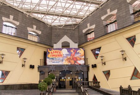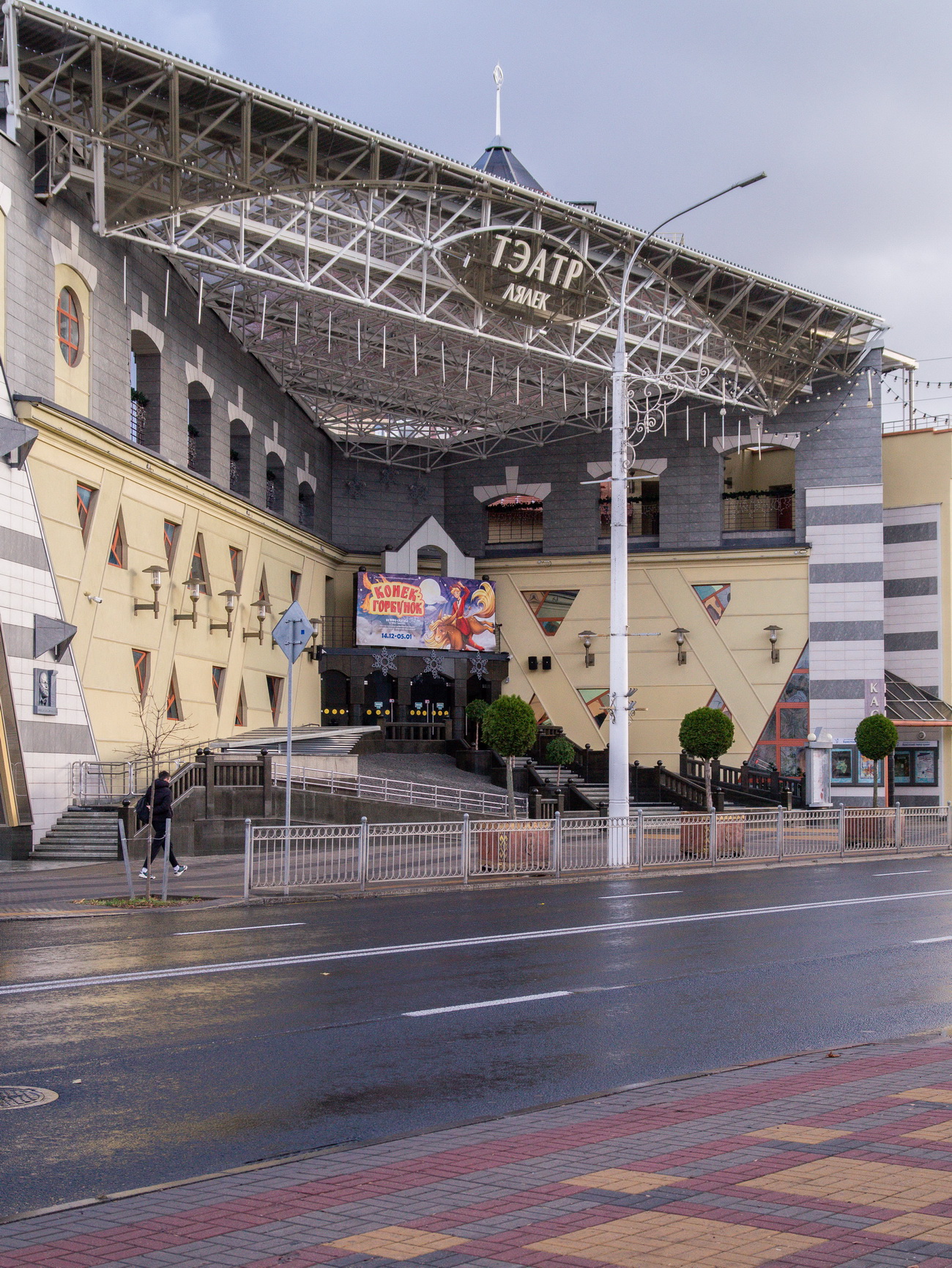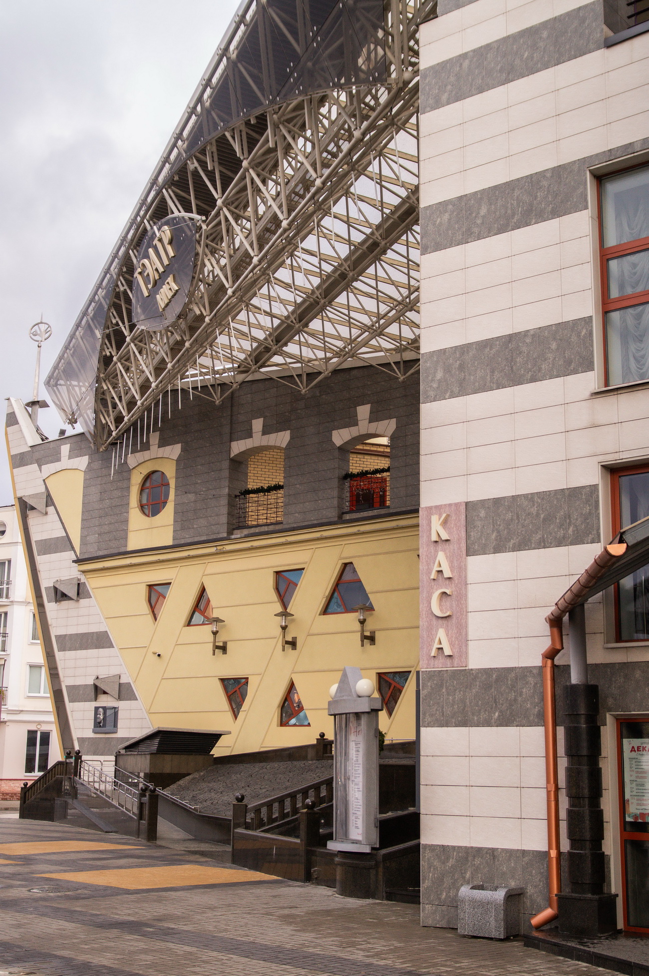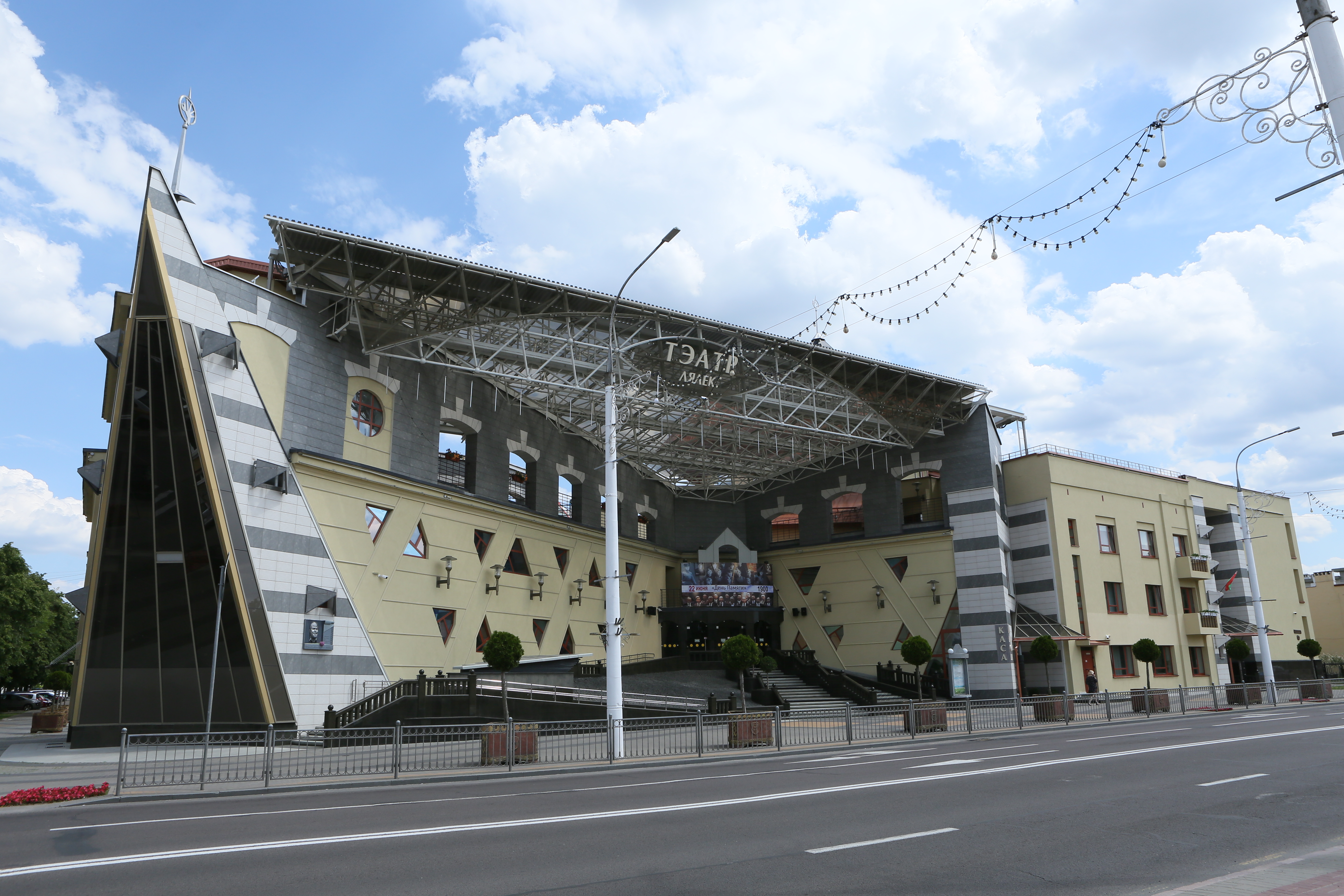 Тэатр - складанае ў плане разнапавярховы з цокальным паверхам будынак. Вышыня паверхаў - 4,20 і 3,60 м (цокаль); 3,30 м (асноўныя паверхі). Сцэна - першага тыпу (С1) з чатырма працоўнымі галерэямі і каласнікамі. У мэтах стварэння пэўнай архітэктурнай выявы тэатра прыменены структурныя канструкцыі, як вонкавыя, так і інтэр'ерныя, нахільныя па кроквах (у тым ліку веерападобныя) пакрыцці, дэкаратыўнае пакрыццё сцэнічнага аб'ёму, святлопразрысты купал. Уваход у тэатр прадугледжаны па вонкавых парадных усходах або пандусе непасрэдна ў двухсветны вестыбюль з гардэробам і санітарнымі вузламі або праз касавы вестыбюль. Артысты і работнікі тэатра праходзяць на працоўныя месцы праз службовы вестыбюль. Прадугледжаны комплекс падсобных памяшканняў (майстэрні, гараж і інш.) з самастойнымі ўваходамі ў іх з унутранага гаспадарчага двара. У крыле будынка тэатра на трох паверхах запраектаваны кафэ і бары.