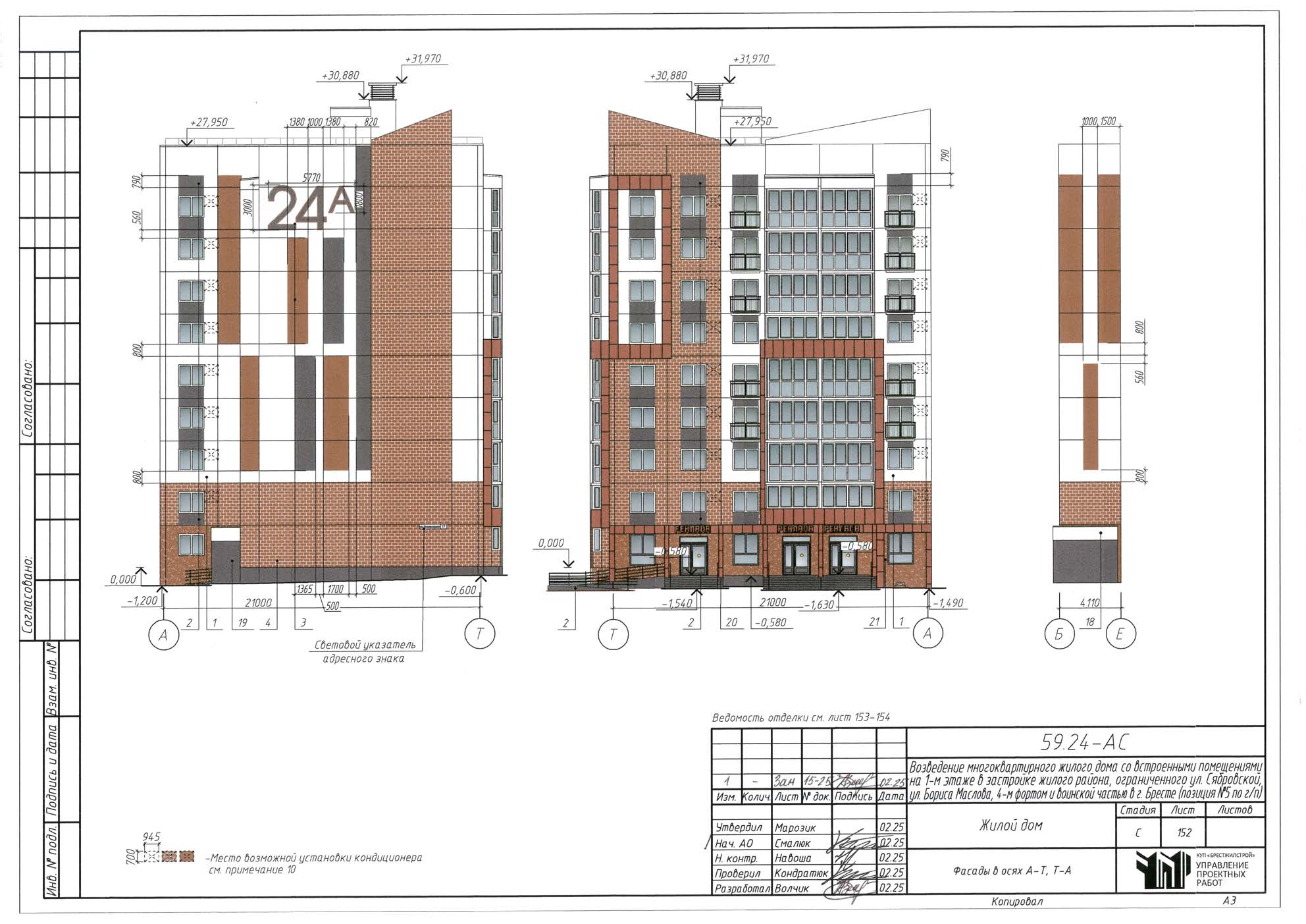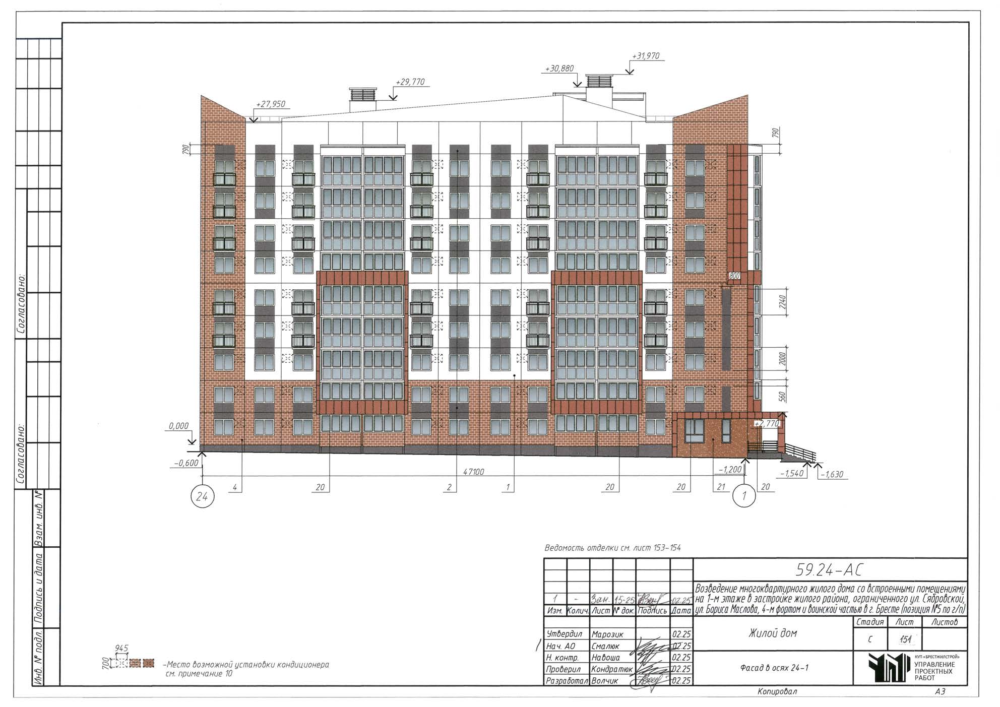 Строительным проектом предусмотрено возведение 2-секционного 9-этажного здания 79-квартирного жилого дома со встроенными помещениями на 1-ом этаже в застройке жилого района, ограниченного ул. Сябровской, ул. Бориса Маслова, 4-ым фортом и воинской частью в г. Бресте (поз.5 по г/п). Здание с техническим подпольем, теплым чердаком, с плоской рулонной крышей, Г-образной формы в плане, разработано на базе индустриальных изделий КПД серии 90М Бр. Конструктивная схема здания дома решена на основе безригельной жесткой конструктивной схемы, образованной плоскими сборными дисками перекрытий и несущими внутренними и наружными стеновыми панелями.