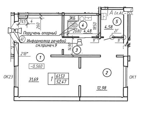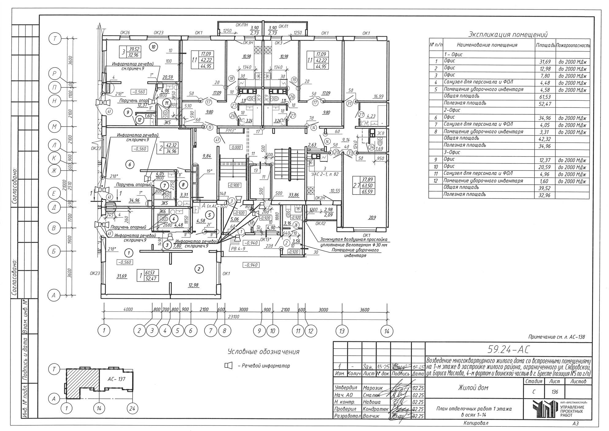 Входы во встроенные помещения предусматриваются непосредственно снаружи. На входах предусматриваются лестницы, ведущие на крыльцо, устройство пандуса. В каждом встроенном помещении предусмотрен санузел (адаптирован для физически ослабленных лиц), помещение уборочного инвентаря. Высота встроенных помещений – 3,09 м.кв. Оконные блоки предусматриваются из ПВХ профиля. Потолок – устройство звукоизоляционного потолка (плиты минераловатные) с подшивкой ветрозащитной пленкой, стены – подготовка под чистовую отделку, покрытие пола – цементно-песчаная стяжка. Проектом предусмотрено следующее инженерно-техническое обеспечение здания: отопление (предусмотрено отдельной веткой от ИТП жилого дома с устройством отдельных узлов учета тепла для каждого встроенного помещения, а также общего узла учета тепловой энергии для встроенных помещений), холодное централизованное водоснабжение, горячее водоснабжение предусмотрено от электроводонагревателей V=15 л., канализация, приточно-вытяжная вентиляция с естественным и механическим движением воздуха, электроснабжение, пожарная сигнализация и оповещение о пожаре, оповещение о чрезвычайных ситуациях, система вызова помощи в санузлах, наружные входы в помещения и входы в санузлы оборудованы речевым (звуковым) электронным информатором с дистанционным управлением.