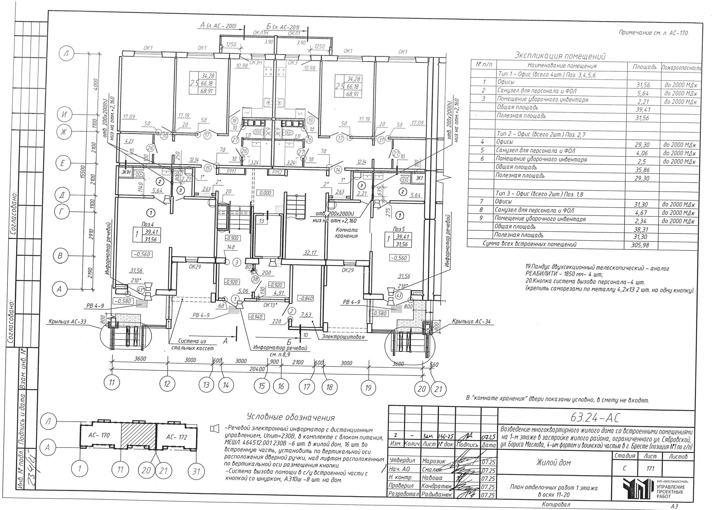 В каждое встроенное помещение предусмотрен отдельный наружный вход, санитарный узел (оборудован для доступа физически ослабленных лиц), помещение уборочного инвентаря. Покрытие пола встроенных помещений – цементно-песчаная стяжка, потолок – устройство звукоизоляционного потолка (плиты минераловатные) с подшивкой ветрозащитной пленкой, стены – подготовка под чистовую отделку. Высота встроенных помещений – 3,09 м.кв. Проектом предусмотрено следующее инженерно-техническое обеспечение здания: отопление (предусмотрено присоединение отдельной веткой от ИТП жилого дома с устройством отдельных узлов учета тепла для каждого встроенного помещения, а также общего узла учета тепловой энергии для встроенных помещений), холодное централизованное водоснабжение, горячее водоснабжение предусмотрено от индивидуальных электроводонагревателей, канализация, приточно-вытяжная вентиляция с естественным и механическим движением воздуха, электроснабжение, радиофикация, пожарная сигнализация.